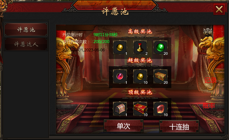 1、许愿池共有3个奖池,每个奖池共有9种道具,玩家每个奖池可自选3个奖励,增加到奖池中。