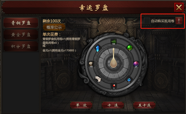 罗盘界面增加“自动购买抵用卷”勾选选项,勾选后,当玩家抽取时抵用卷不足时,将消耗对应元宝/金元来补齐次数。